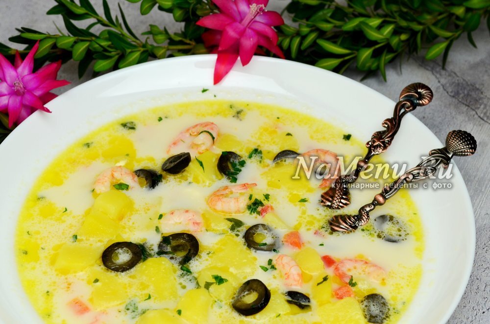 Необходимые продукты: - креветки – 300 г, - сыр плавленый – 100 г, - вода – 1-1,2 л, - картофель – 1-2 шт., - лук – ½ шт., - морковь – ½ шт., - перец болгарский – 1/3 шт., - соль – 1 ч. л., - оливки – 30 г, - подсолнечное масло – 30 мл, - лавровые листья – 2 шт., - листья петрушки 💧Креветки на 1-2 минуты бросаем в кастрюлю с кипятком, достаём 🥔Картофель порезанный кубиками, лавровые листья и соль заливаем водой и варим 10 мин. 🥕Лук и морковь нарезанные мелкими кубиками жарим на подсолнечном масле до зарумянивания 🍤Остывших креветок разделываем: отделяем головы, снимаем панцири 🌱В кастрюлю кладем поджаренные овощи, порезанный перец и петрушку. Затем нарезанные кольцами оливки и кубиками сыр ⏳Варим 25 мин. и добавляем креветки, варим ещё 2-3 мин. https://namenu.ru/11285/Syrnyj_sup_s_krevetkami/