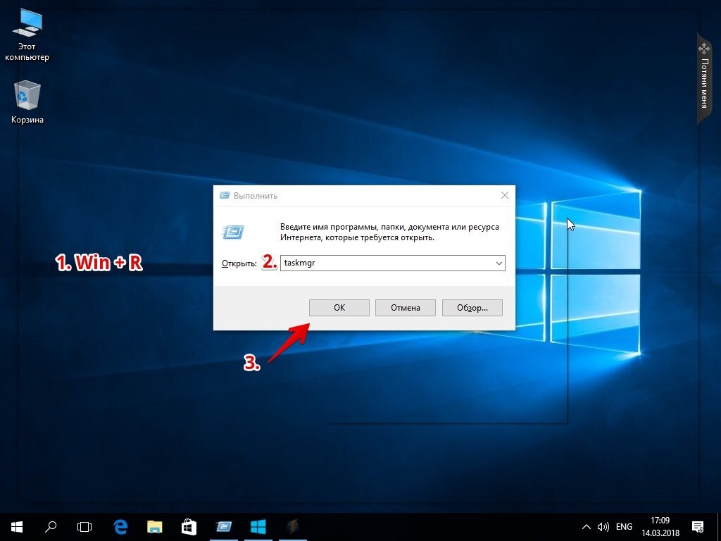 - 1.Отправляемся в диспетчер задач. Для этого одновременно жмем кнопку с окном-логотипом Win + клавишу R, а в появившейся строчке вводим:taskmgr