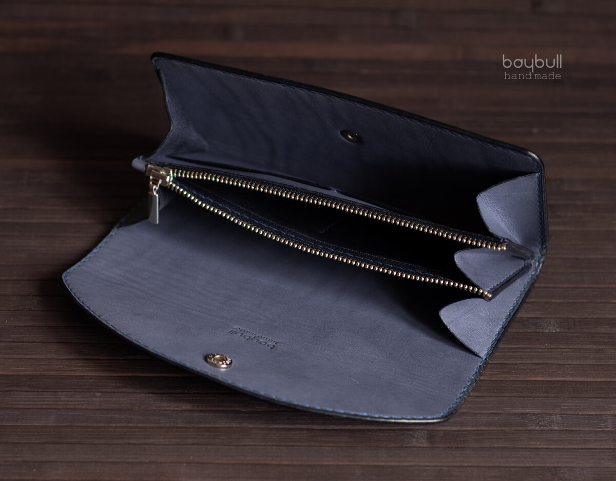 Яркий, стильный и удобный аксессуар из натуральной эластичной кожи КРС. Сшит на 100% вручную, прочным седельным швом, вощёными нитками. Внутри два отдела для купюр, большой карман для мелочи и четыре кармашка для карт. Размер 20х9 см. 3500 рублей