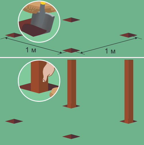 Рассмотрим порядок сборки и установку садового душа из пиломатериалов. Инструменты и материалы для работы: рулетка, карандаш, степлер для мебели, емкость для раствора, угольник, отвес, ножовка, шуруповерт, дрель, саморезы. Садовый душ своими руками Выкапываем четыре лунки на глубину около 400 мм, со сторонами 300x300 мм, с отступом друг от друга не ближе 1000 мм по вершинам условного квадрата. В них устанавливаем стойки из деревянного бруса сечением 100x100 мм и длиной 3000 мм. Из бруска сечением 50x50 мм нарезаем шесть перемычек длиной 800 мм. Отступив от нижнего края каждой стойки 900 мм, а от верхнего — 500 мм, наносим метки. Просверлив отверстия по меткам, закрепляем перемычки к стойкам саморезами 150 мм. Попарно соединяем верхушки стоек брусом 100x100 мм и длиной 1000 мм. По ним настилаем обрешетку из пяти брусков 50x50 мм и длиной 1000 мм. По краям лунок устанавливаем опалубку и, выставив стойки по отвесу, заливаем стяжку с гидроизоляцией и армированием. По перемычкам и стойкам з