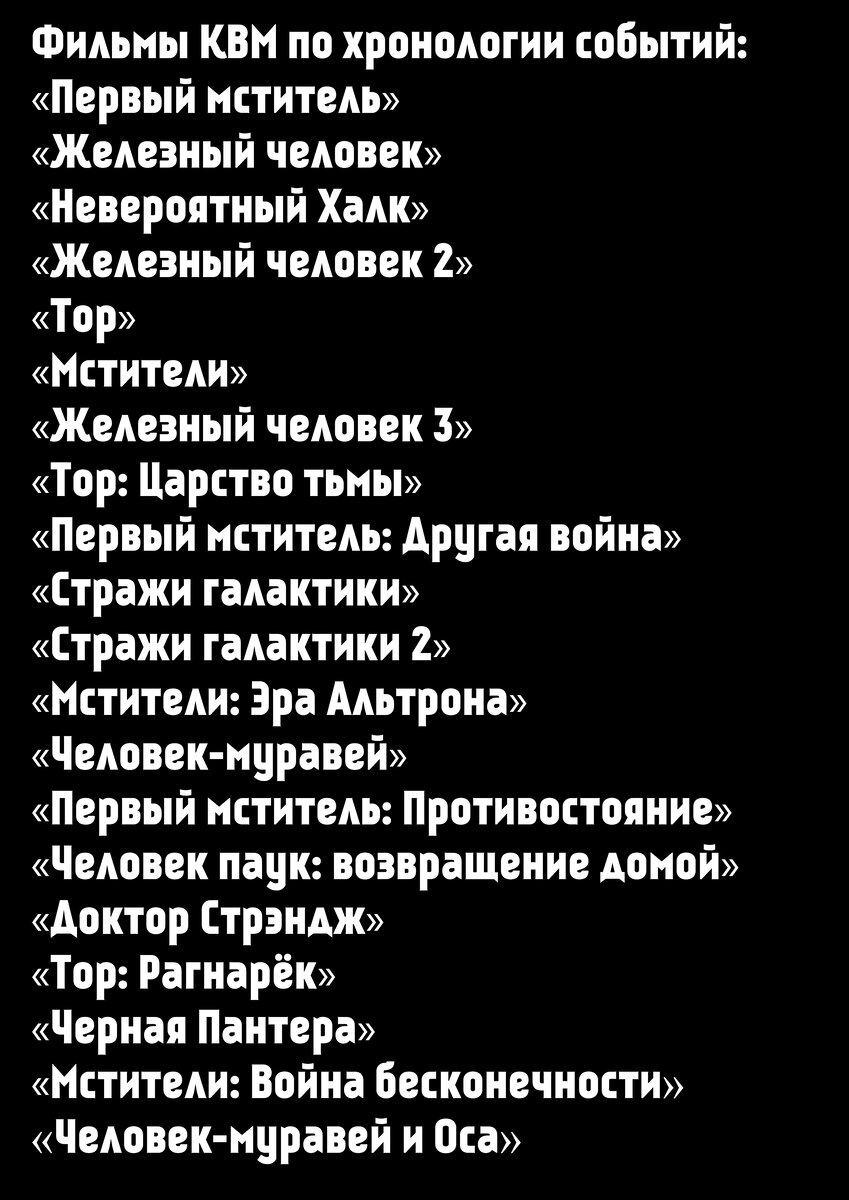 Прежде чем отправиться в кино на главную премьеру года "Мстители финал" нужно хорошенько подготовиться к этому трёхчасовому шедевру. Нам необходимо посмотреть несколько фильмов от КВ Marvel для того, чтобы у нас была полная картина и представление о происходящем. Сам я являюсь фанатом комиксов и фильмов по ним и мой билет на премьеру уже лежит в кармане. А если вы не очень понимаете смысл всего того, что происходит в кинолентах этой кинокомпании, то рекомендую всё же посмотреть, возможно, что вам понравится и вы тоже станете фаном. Это примерная хронология событий без учёта сериалов. С сегодняшнего дня начинаем смотреть по одному фильму и к 29 апреля мы будем полностью готовы к просмотру последнего фильма третьей фазы киновселенной.