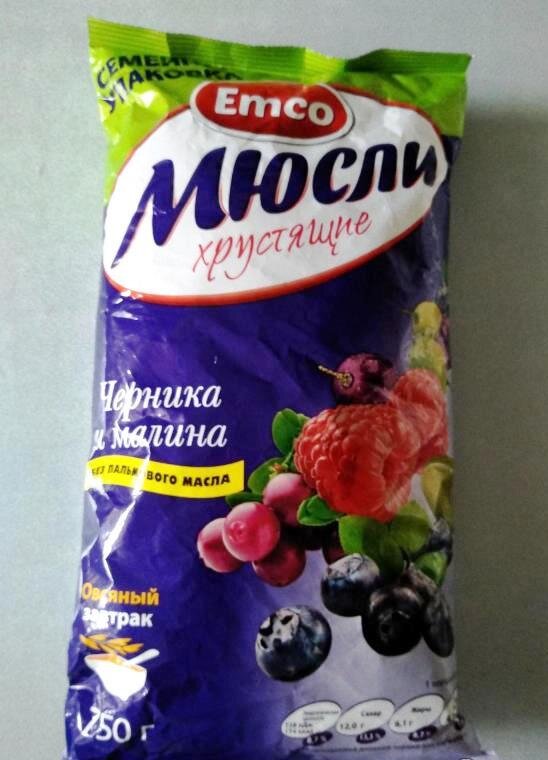 Всем привет! Продолжаю делиться своими впечатлениями от покупок, находками и разочарованиями. Для меня мюсли это продукт не первой необходимости, есть - хорошо, нет и не нужно. Одно время покупала мюсли с семечками ТМ "365 дней" в Ленте, но вот вспомнив об этом в магазине, в продаже их не нашла, а зато увидела другой вариант и взяла на пробу. Пакет яркий и сразу бросается в глаза, в семейной упаковке 750гр хрустящих мюслей с черникой и малиной. ТМ Emco мне не знакома, но заверение, что продукт приготовлен без применения пальмового масла работает в пользу покупки. Подробная информация о продукте на обратной стороне пакета и для удобства я сделала несколько фрагментов. В левой части пакета на 5ти языках приводится состав, пищевая и энергетическая ценность продукта, условия хранения. Состав не идеален - есть крахмал и ароматизатор - зачем (?), я против. Вот обязательно нужно подпортить впечатление - цельнозерновой овсяный продукт хорош и полезен сам по себе, неужели нельзя обойтись