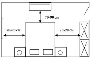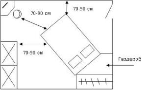 Сегодня говорим о том, как правильно расставить мебель в квартире, чтобы и выглядело гармонично, и располагалось удобно. Итак, начнем со спальни. Центром спальни является, конечно, кровать. Поэтому и интерьер и стиль комнаты часто зависят именно от кровати и ее расположения. Варианты размещения кровати очень разнообразны, рассмотрим некоторые из них схематически: 1. Т-образный 2. Диагональный 3. Островное расположение (площадь помещения должна быть более 20 кв. м.) На всех приведенных примерах видно, что расстояние между кроватью и остальной мебелью должно быть комфортным для прохода и составлять 70-90 см. Это относиться ко всем помещениям в квартире, в том числе и кухни. На ней важно такое понятие, как «уровень сервиса», на который не оказывают влияние ее габариты, степень насыщенности бытовой техникой, а зависит от правильной организации пространства, что, в свою очередь, позволяет экономить до 30-40 % времени, затрачиваемого на приготовление пищи. Очень важным является взаимосвяз