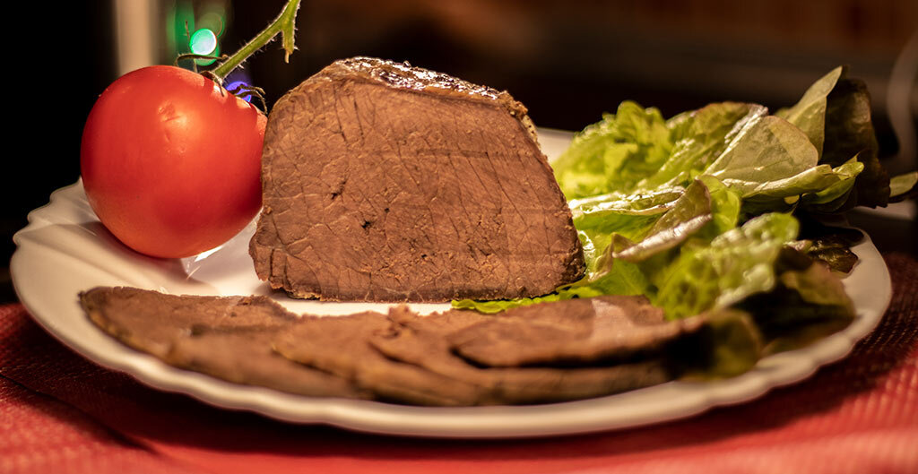 Нарезать тонкими пластинами поперек волокон и подать к столу.