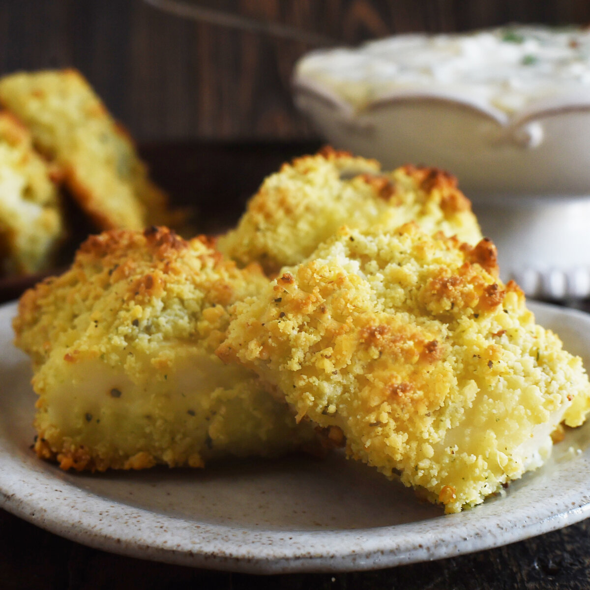 4. Форму для запекания сбрызнуть маслом, выложить филе, сверху выложить хлебную массу, утрамбовать руками. Выпекать 15-20 минут, до золотистого цвета. Приятного аппетита!