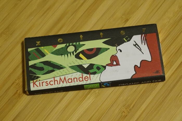 Пачка австрийских Zotter-ов прямо по курсу. Сегодня плитка карамельной шоколадной глазури с вишней и миндалем.