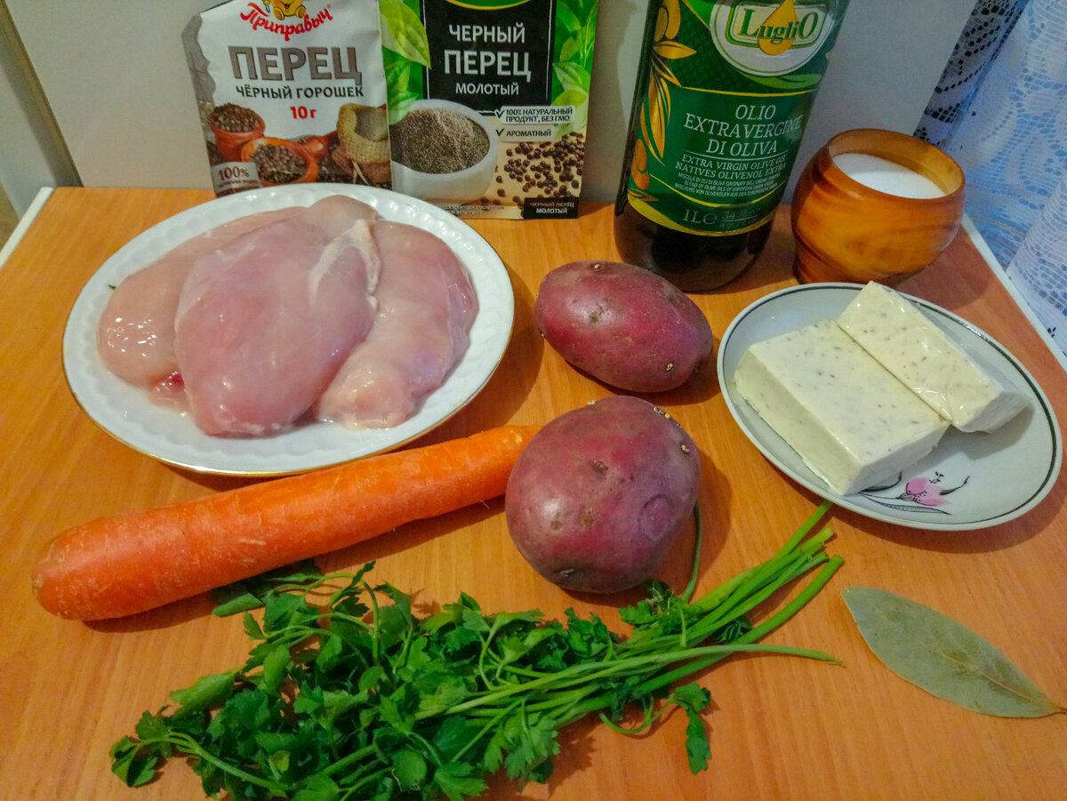 Доброго времени суток, дорогие мои хозяюшки😊 Сегодня мы с Вами будем готовить сырный суп. Это очень простое и доступное по бюджету блюдо. Кроме того, очень вкусное и полезное) И да, готовится быстро) Уверена, многим понравится такой суп) Ингредиенты: Приготовление: Режем мясо небольшими кусочками, картошку - кубиками, а морковь ломтиками, как на фото. Сырки натираем на мелкой терке. В разогретую сковороду вливаем оливковое масло и обжариваем слегка курочку. Наливаем в кастрюльку 2 л воды, перекладываем в нее мясо и доводим до кипения. Затем добавляем в бульон лавровый лист и перец горошком. Варим 10 минут. Затем добавляем в суп картофель и морковь. Как закипит, убавляем огонь и варим 20 минут. Теперь добавляем натертый плавленый сыр и помешиваем до полного растворения. Солим и перчим. Вынимаем лаврушку, это нужно для того, чтобы в нашем вкусном супе затем не появилась горечь. Далее добавляем рубленую зелень и варим еще 1 минуту. Вот и все! Приятного аппетита Вам и Вашим близким, доро