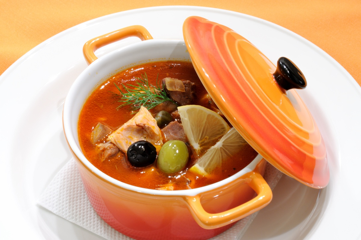 Для приготовления "Классической Солянки" нам понадобится : • 100г томатной пасты • 4 луковицы • 50г каперсов • 1 морковь • 100г маслин • 4 соленых огурца • 300г мясо (копчености, включая молочные сосиски) 500г костей (мясные копченые и обычные говяжьи) • сливочное масло • растительное масло • черный перец, соль • 1 лимон • 3 шарика душистого перца • 2 лавровых листа • зелень • 1/3 стакана рассола Приготовление: 1) Кости с мясом поставить варить, после закипания слить первую воду. Промыть мясо и залить чистой водой. После закипания добавить нарезанную морковь, стебли зелени (перевязанные ниткой), соль, перец, лавровый лист и варить до готовности. Готовый бульон процедить через 3 слоя марли 2) Лук нарезать и выложить в разогретую на сковороде смесь сливочного и растительного масла. Посолить, добавить томатную пасту, выложить в форму для запекания/на противень
