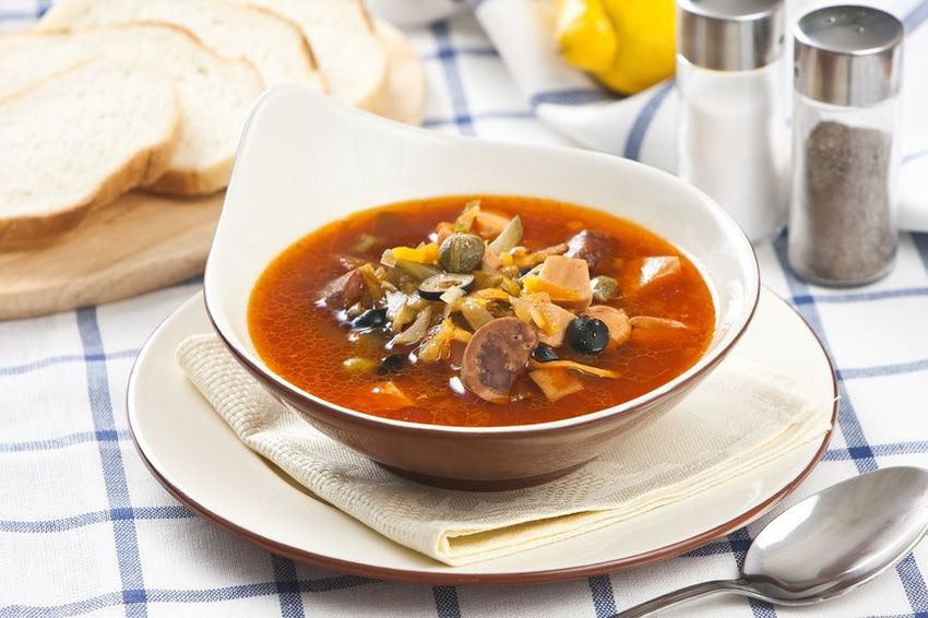Для приготовления блюда нам понадобится : • 250г говядины (мякоти) • 300г костей • 140г говяжьих почек • 100г окорока или ветчины • 100г сосисок • 200г лука • 200г соленых огурцов • 40г каперсов • 40г оливок • 80г маслин • 1 лимон • 2ст.л. сливочного масла • 2ст.л. томатной пасты • 150г сметаны • 5 веточек петрушки • черный перец горошком,соль • 2 лавровых листа Приготовление: 1) Сварить мясной бульон (с перцем и лавровым листом) на второй воде, мясо вынуть, нарезать, бульон процедить 2) Говяжьи почки промыть, очистить от пленки, разрезать пополам и залить холодной водой на 3 часа. Каждый час менять воду, промывать почки. Через 3 часа довести почки до кипения, варить 1,5 часа до готовности на медленном огне 3) Лук обжарить до прозрачного цвета в сковороде, добавить томатную пасту. В идеале лучше запечь как в предыдущем рецепте, но можно ограничиться тушением в сковороде 4) Ветч
