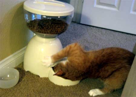 Кормушка обеспечивает пищей кота на пять суток. Но существуют дорогостоящие экземпляры, обеспечивающие едой животное до трех месяцев.