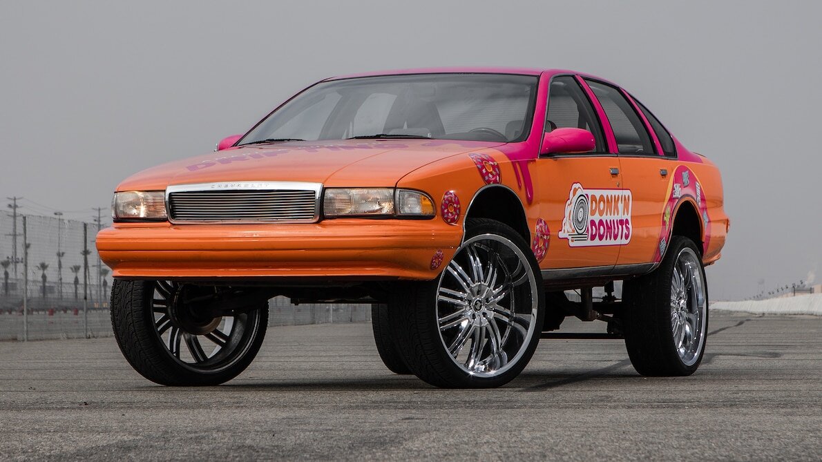 Существует в США такое направление тюнинга как DONK. Выражаясь полит корректным языком, тема исключительно афро-американская. Главный атрибут – колеса огромных размеров. На фотографиях ярчайший пример вышеуказанного сумасшествия на базе Chevrolet Caprice Classic 1995 года выпуска. DONK возник сравнительно недавно, в начале 21 века, как альтернатива лоурайдерам и хот-родам, распространившимся по всему свету. Обеспеченным черным парням необходимо было как-то выделяться и они, глядя на то как лоурайдеры занижают машины, решили их радикально поднять и удивить общественность размером колес! Встречаются катки диаметром более 30 дюймов, естественно с низкопрофильной резиной. Как говорится: «Зачем вы канализационные люки обклеили изолентой?!» :) Чтобы запихать в машину такие колеса приходится серьезно модифицировать подвеску и кузов. Оказавшиеся на всеобщем обозрении после лифта детали подвески и мосты красят в яркие цвета либо покрывают хромом. Яркие цвета и хром – неотъемлемые характеристики