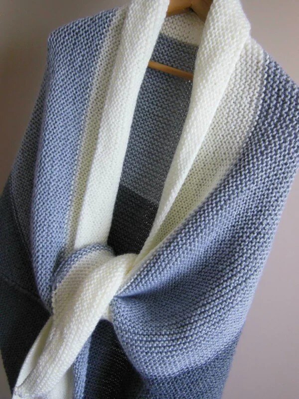 Ух ты, какая отличная идея! Увидела шаль в интернете, очень понравилась. Переход от темного к светлому. Чистый белый цвет вверху. А всего лишь платочная вязка, и вязать - проще некуда! Об этом можно судить по следующему фото: Начинаем вязать снизу, моток темно-синей пряжи закончился - присоединяем голубую нить, а затем белую. Вяжется, наверное, также, как я начала свою шаль: из одно петли связала три, во втором ряду - лицевая, накид, лицевая, накид, лицевая, а дальше в лицевых рядах после кромочной и перед кромочной из одной петли вывязывала две. Изнаночные ряды без прибавок. Давно мечтала связать шаль из такой пряжи с кисточками, но очень трудно вязать, петли плохо видно, подумываю - не продолжить ли вязать другой пряжей? Но нет, придется ежикам плакать и продолжать грызть кактус дальше, уж очень пряжа своеобразная, с другой какой вряд ли удастся красивое сочетание.