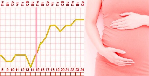 Итак, как я уже писала в предыдущей статье, при беременности базальная температура (БТ) в конце цикла не опускается, а остается на высоком уровне. Обычно – 37 – 37,3 градуса. И сам график может очень многое нам сказать. Итак, смотрите: Красной прерывистой вертикалью отмечен день ожидаемой менструации. Как видите, БТ к этому дню не только не опустилась, но даже немного поднялась. Считается, что комфортная температура для развития эмбриона – как раз 37 – 37,3 градуса. В середине второй фазы базальная температура почему-то упала на 0,3 градуса. Этого не стоит бояться, если это единичный случай. Вероятно, вы имеете дело с имплантационным западанием (ИЗ) температуры. Оно происходит из-за выброса эстрогенов, происходящего при внедрении эмбриона в стенку матки. Может сопровождаться небольшими кровянистыми выделениями. Ярко-красными, а не темными менструальными. ИЗ не всегда удается «поймать» на графике. Если его нет – это не означает, что имплантации не было. Но и провал на графике не говорит