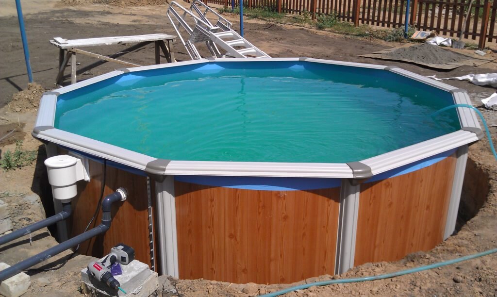 Строительная часть и установка оборудования. Установка оборудования начинаются после того, как бассейн наполнен водой. На сколько его нужно наполнить? Если бассейн стоит на поверхности, то его наполняют до места установки форсунки (на 2 см ниже отверстия). Если бассейн стоит в котловане, то его наполняют на 30 см водой, утепляют (по желанию). После чего начинают обратную засыпку горцовкой (смесь песка и цемента). Соотношение песка к цементу четко не оговорено производителем, поэтому каждый выбирает для себя сам. Мы же за прочность, поэтому 3 к 1 соответственно. Обязательно нужно соблюдать разницу между просыпкой и водой в бассейне в 30 см. Лучше просыпать слоями по 10 см. Трамбовать вручную запрещено. Нужно увлажнить слой засыпки и не допускать просыхания между укладкой новых слоев. Установка оборудования: форсунки и скиммера. После того как бассейн наполнился до форсунки приступаем к ее установке. В месте установки прорезаем пленку острым лезвием и ставим форсунку на водостойкий гер