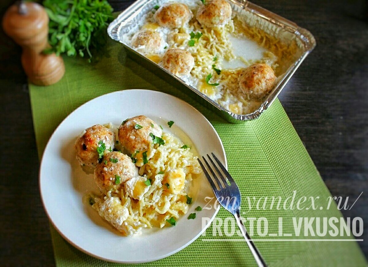 Шаг 5. В форму для выпекания, выкладываем вермишель слоем примерно в 1 см. толщиной. Сверху кладем наши тефтели. У меня остались кубики сыра, я их тоже положила сверху, между тефтелями (это оказалось очень удачным решением потом). Заливаем все оставшимися сливками. Важно, льем не только на макароны, надо так,чтобы сливки попали на каждый тефтель, для этого можно использовать ложку.