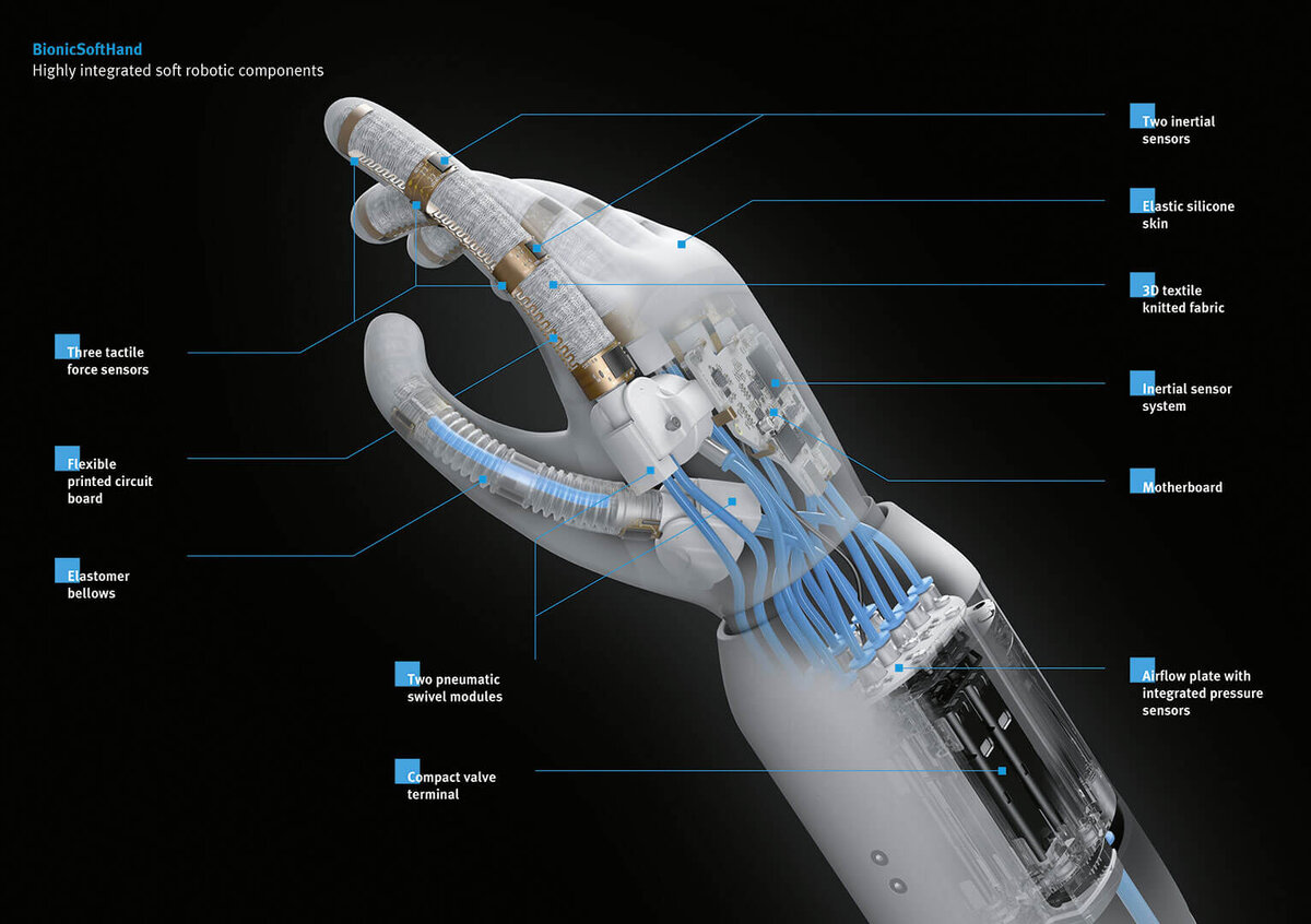 Учеными установлено, что проходят всего какие-то доли секунд и ваш мозг начинает получать расчеты о необходимых движениях, как только в руки попадает тот или иной предмет. Данный навык формируется у младенца и совершенствуется до подросткового возраста. Подобными результатами смогла «похвастаться» компания Festо, которая занимается производством автоматизированных систем и промышленным оборудованием. Роботизированная рука под названием BionicSoftHand отличается невероятной гибкостью, искусственным интеллектом и расчетом алгоритма всех манипуляций. Роботизированная рука – это удачный пример нежного и мягкого рабочего процесса робототехники. Сегодня робот специализируется на перемещение объектов, выполненных из стали, пневматических систем, обладающие большим весом. Практика показывает, что взаимодействие роботов и людей часто заканчиваются непоправимыми последствиями, но эта рука изготовлена из гибкого материала и надувных частей, что гарантирует сниженную травмаопасность. Для создани