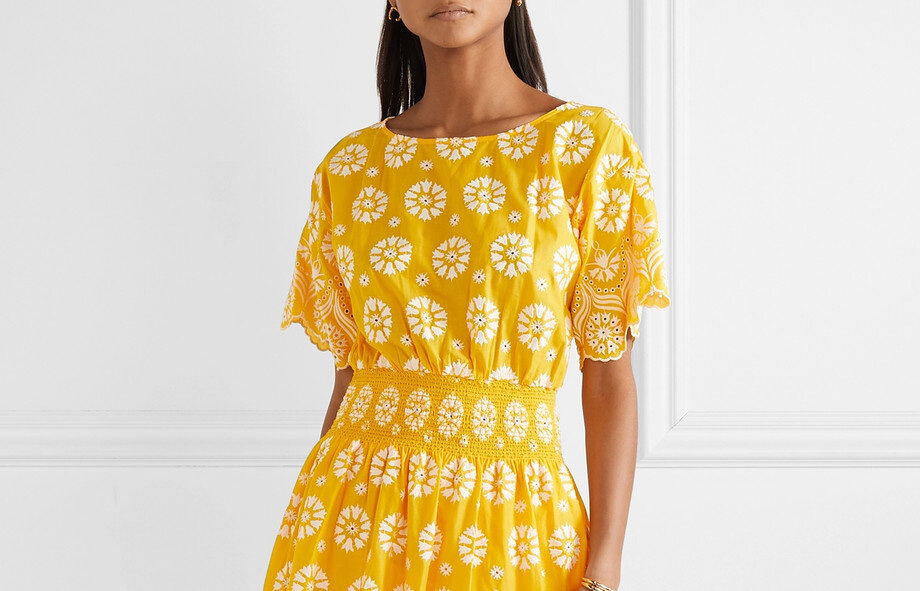 Платье-рубашка с талией в складочку от Thom Browne, универсальное винтажное платье от HVN, которое имеет боковые скрытые кармашки для телефона или помады, выполнено в лавандовой гамме и будет хорошо сочетаться с босоножками или кедами, яркое желтое платье с цветочным белым принтом от Tory Burch дополнено резинкой на талии, его можно носить с белыми босоножками или сандалиями в тон цветочному принту.