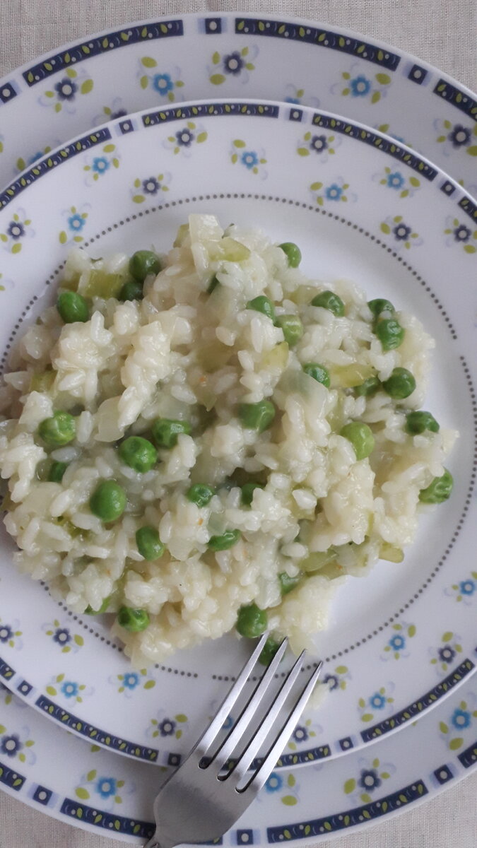 Ингредиенты: 250 г риса 200 г замороженного горошка 1 стебель сельдерея 2 луковицы овощной бульон (или овощные бульонные кубики) соль, перец по вкусу Приготовление: 1. Разогреваем в сковороде растительное масло. 2. Мелко режем лук и сельдерей. Поджариваем до прозрачности лука. 3. Кладем рис в сковороду и обжариваем минут 5, постоянно помешивая. 4. Добавляем овощной бульон или заливаем рис кипятком, а потом добавляем овощные кубики. 5. Готовим до мягкости риса. 6. Кладем горошек, прогреваем несколько минут. Горошек не должен быть переваренным. Блюдо готово. Приятного аппетита!