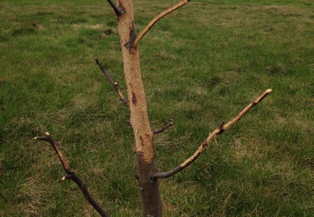 Если повреждения затронули древесину или опоясывают деревце вкруговую, то придется восстанавливать нарушения с помощью прививки мостиком. Для начала очистите поврежденный участок штамба, удалите сухую кору и временно обвяжите темной пленкой.