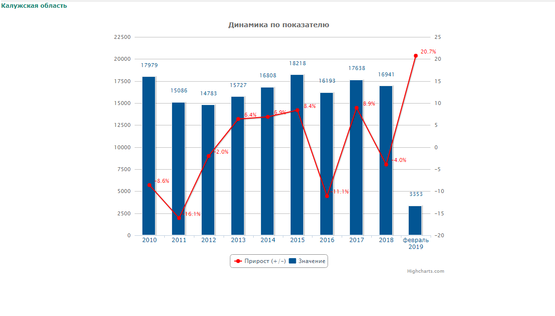 Как сообщает портал Правовой статистики, за февраль этого года в Калужской области наблюдается резкий рост преступности – 20,7% фиксирует портал. Портал построил график, основываясь на сведениях о состоянии преступности и результатах расследования преступлений. Статистику для них предоставляют информационные центры МВД, ГУВД, УВД субъектов РФ.
