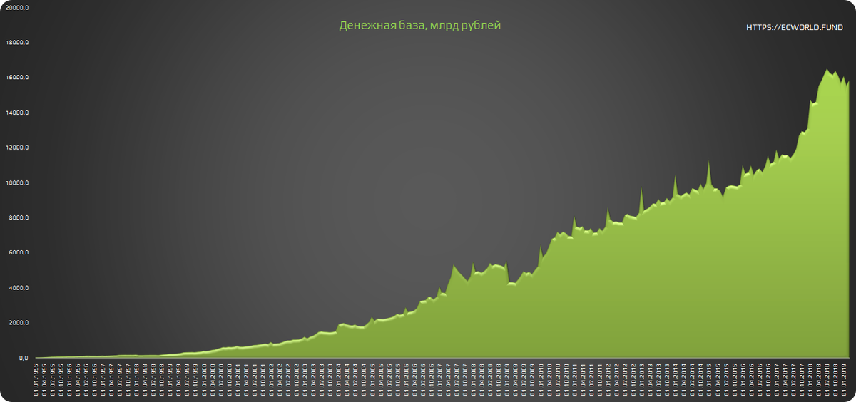 Роста экономики нет (если вычесть реальную инфляцию), инфляция (как нам говорят) минимальна, а денежная база растет. ЦБ неустанно проводит эмиссию, в том числе закрывая дыры банков после национализации.