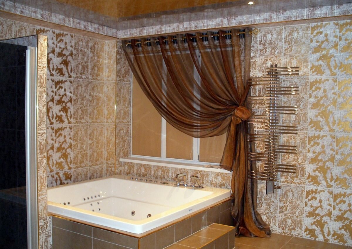 Если окно находится рядом с ванной, то шторы будут просто необходимы. И чем плотнее, тем лучше. Это поможет избежать не только посторонних взглядов, но и защитит стекло от брызг.
