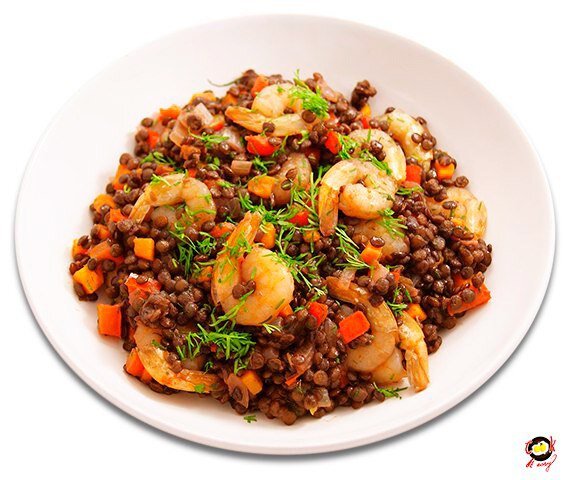 Из красной чечевицы, помидоров и креветок можно приготовить вкуснейший, а также низкокалорийный салатик, который рекомендуется включить в диетическое меню. Время приготовления 1 час. Набор ингредиентов: Рецепт приготовления теплого салата из чечевицы и креветок: Промыть и на 30 минут замочить в чистой прохладной воде чечевицу, затем пересыпать в небольшую кастрюлю и варить четверть часа. Далее нарезать полукольцами очищенный лук-шалот. Промыть и разрезать помидоры, после этого влить в подготовленную сковороду половину порции масла. Насыпать в сковороду гранулированный чеснок, затем добавить небольшое количество зелени, регулярно помешивая обжаривать две минуты эти ингредиенты, далее добавить очищенные креветки. Продолжить процесс жарки на слабом огне 3 минуты, затем добавить отваренную чечевицу, хорошо перемешать ингредиенты, убрать сковороду с плиты. После подготовить еще одну сковороду, влить в нее оставшееся масло, добавить нашинкованный лук-шалот и нарезанные помидоры, обжаривать о
