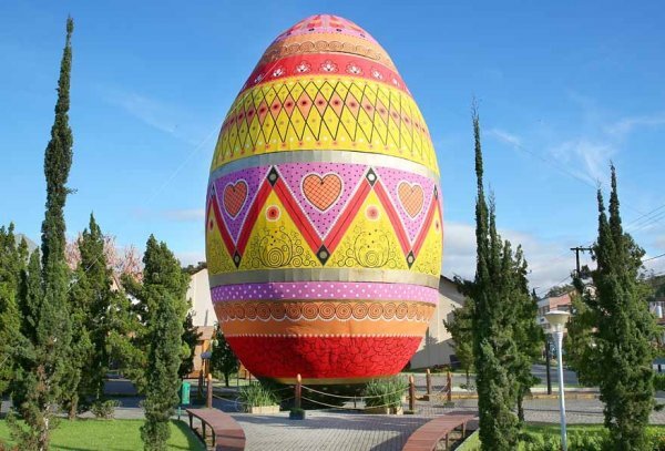 Туристы, которые в этом месяце побывают в городе Помероди (штат Санта-Катарина, Бразилия) смогут не только посетить местный пасхальный фестиваль, но и увидеть крайне необычную достопримечательность. Речь идет о гигантском пасхальном яйце, которое официально признано самым большим в мире. Тематическая инсталляция достигает 15,02 метра в высоту, а ее диаметр равен 8,72 метра. На создание такого разноцветного чуда, выполненного я красно-желтых тонах, у умельцев из Бразилии ушло 48 дней, а его монтаж занял не один час. Увы, полакомиться самым большим в мире пасхальным яйцом никому не удастся, ведь оно выполнено из стали. Эта праздничная скульптура состоит из четырех больших секций, созданных по отдельности и соединенных в одну конструкцию. Главным спонсором выступила местная организация по туризму «Associa??o Visite Pomerode». Идея сделать инсталляцию в форме пасхального яйца была выбрала не случайно – с помощью такой гигантской скульптуры власти Помероди решили привлечь внимание туристо