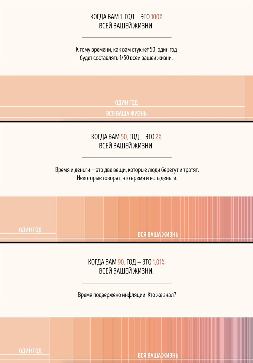 Эта интерактивная шкала времени объясняет, как с годами все больше и больше меняется наше восприятие времени, которое по ощущениям бежит все быстрее и быстрее. Она показывает, как мы чувствуем прожитый год, сравнивая его с нашим «абсолютным» временем. Шкалу придумал консультант по дизайну BMW из Австрии Максимилиан Кинер, основываясь на высказывании философа Поля Жане. В упрощенной форме оно звучит так: 10-летний ребенок ощущает 1 год как 1/10 всей своей жизни, а 50-летний человек — как 1/50. Между тем вся жизнь, очевидно, представляет собой постоянную (или же абсолютную) величину. Когда ребенку всего 1 месяц, то неделя составляет четверть всей его жизни, а потому, естественно, кажется вечностью. Если вам 14 лет, 1 год составляет около 7% вашей жизни и тоже представляется довольно большим промежутком. Но в возрасте 30 лет неделя — всего лишь крошечная часть жизни, а год для 50-летнего человека — лишь 2% жизни, поэтому вы субъективно ощущаете эти интервалы как незначительные и уверены,