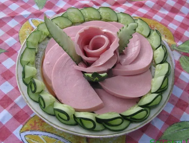 Огурец универсальный овощ для украшения различных видов нарезок, ведь он яркий и податливый, поэтому данную подборку я посвящу ему и постараюсь подробно рассказать как так сделать. Например, чтоб получить такой веер, вам необходимо разрезать огурец пополам, и ещё на две три части, по размеру зубочистки. Затем тоненько нарезаем на полукруги, протыкаем шпажкой и аккуратно раскрываем веером. За счёт того, что они плотно расположены друг к другу эта форма не распадётся. Такой вариант называют бабочка, листик или сердечко, вариаций много, а делается одинаково. Небольшой кусочек половины огурца, в котором делаем два надреза и сворачиваем их к середине. Держится прекрасно, если не слишком толстый ломтик. Для того, чтобы сделать шахматный вариант,ва всего-то нужно вырезать две плоски на спинке огурчика, а затем обычная нарезка на ломтики, только в конце слегка сдвинуть их, получается очень креативно. Самое простое - это листья - делаются небольшими надрезами перпендикулярно, затем каждый немно