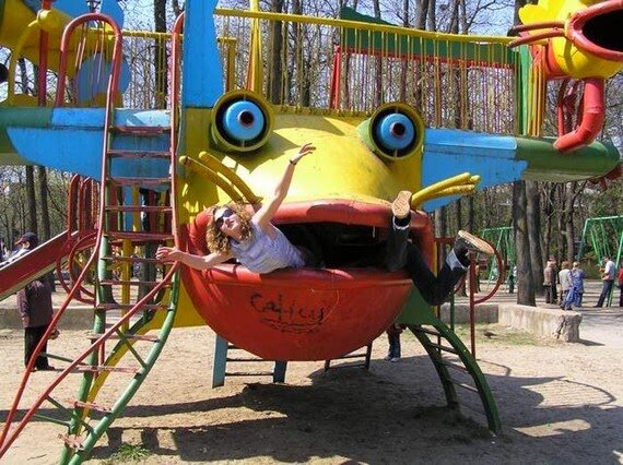 Нередко детские площадки в России создают люди, у которых явно не все дома. Только белой горячкой можно объяснить те ужасы, которые они предлагают детям. Готовы? Держитесь крепче, это ад! Просто в бассейн еще не залили воду. Российский народный транспорт — самоходный пенек. А это что за тварь из преисподней?! Впрочем, этот монстр даже пострашнее. Ну и еще один экземпляр — крокодил, изо всех сил пытающийся взлететь. Кажется, волк все-таки пожевал трех поросят. Чебурашка как бы говорит нам: «Нет! Не ходите на детские площадки! Пощадите свою психику!»