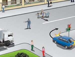 Мы видим, что на перекрестке движением руководит регулировщик. Так же имеется работающий светофор. По правилам дорожного движения, сигналы регулировщика имеют приоритет над светофором. Жест регулировщика разрешает движение легковому автомобилю во всех направлениях, т.к. стоит левым боков к нам и правая рука вытянута. Значит, следуя указаниям, легковой автомобиль может выполнить поворот направо, но при этом должен уступить дорогу пешеходам.