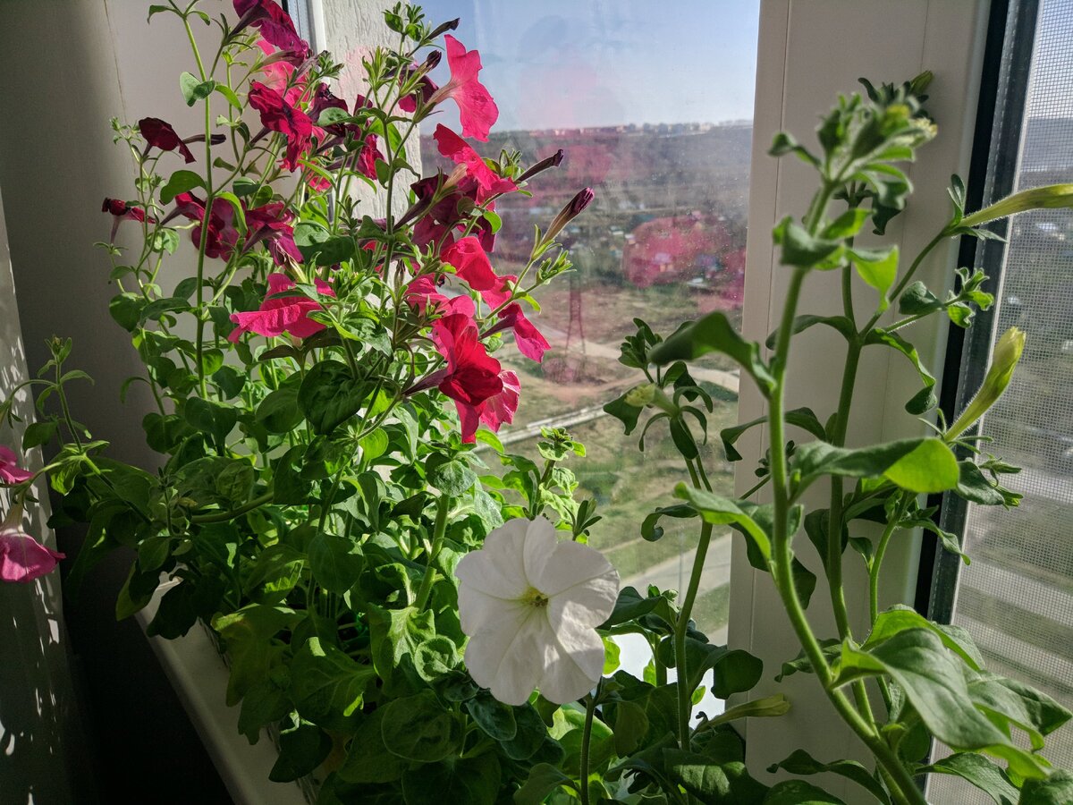 Вернулась я с отдыха, а дома ждут меня петуньи-переростки. Муж поливал, ухаживал за ними. Они видимо от обилия солнца, ежедневной поливки и вымахали. Посадку петуньи в подвесные кашпо планирую в 10-х числах мая. Сейчас увезла всю рассаду петунии в прохладную теплицу. Может холод приостановит обильное цветение. Да и подоконники у меня не резиновые, пора мыть окна к Пасхе. Есть сорта петуньи, которые обильно цветут, но не вытянулись за солнцем: Эти петуньи на рассаду я посадила 1 февраля, в следующем году буду сажать 1 марта. Рано зацвели, вытянулись за ярким солнцем, которое кстати в моей квартире целый день. К слову, петуньи ни разу не подкармливала. Как поживают ваши цветочки?