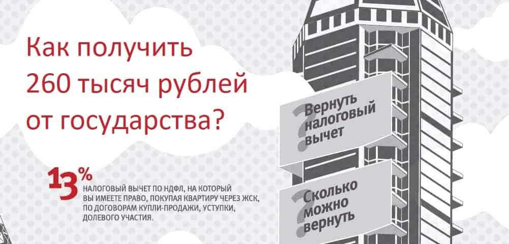 Как получить 260 тысяч от государства? Немногие знают, что каждый россиянин имеет право раз в жизни получить 260 000 рублей от государства. Это право возникает, если вы покупаете или уже купили жилье. Сумма полагается любому гражданину РФ, который платит подоходный налог и покупает недвижимость для себя или для несовершеннолетнего ребенка. Сколько именно можно получить: 13% от стоимости квартиры (но не более чем с 2 000 000 рублей). Если собственников двое, то вычет может получить каждый, т.е. если квартира стоит 4 000 000 рублей (доли 50/50), то каждый из собственников получит по 260 000 рублей, итого — 520 000 рублей (актуально для квартир, купленных после 01.01.2014 г.). Если жилье стоит меньше 2 000 000 рублей, то можно «добрать» недостающую сумму в момент следующей покупки недвижимости. Если жилье куплено в ипотеку, то, кроме 13% от стоимости жилья, вы также имеете право получить 13% от суммы уплаченных процентов по ипотеке. Т.о. те, кто покупает недвижимость в ипотеку, имеют во