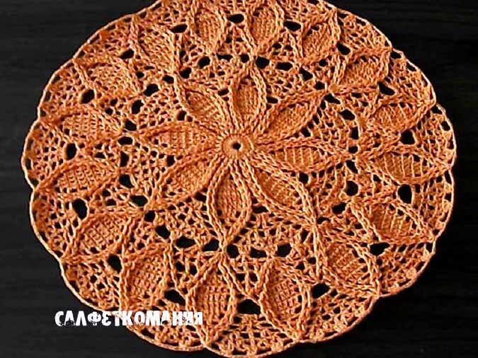 У меня связалась вот такая небольшая салфетка с объемными листочками. Салфетка выглядит просто, она такая плотненькая, не ажурная, но интересная. Благодаря контуру листиков из рельефных столбиков получается объемный эффект. Пряжа у меня «ирис» абрикосового цвета. Взяла крючок с номером 1,25 – это мой любимый номер для таких ниточек. В результате диаметр салфетки вышел всего 27 см, хотя на фотографии в журнале она мне казалась большой. Вообще, для рельефных салфеток рекомендуется использовать крючок №2. Многие рукодельницы любят таким вязать все салфетки, но я вот не могу)). Можно попробовать ниточки потолще, а может кому то такая маленькая и нужна. Главное, чтобы пряжа была не белая, потому что в белой несколько теряется эффект объема. А еще по схеме такой салфетки получится замечательный коврик! Видео мастер класс я тоже сняла, он в двух частях. Салфетка с объемными листочками - видео мк Схема салфетки с объемными листиками Рисунок в салфетке состоит из двух ярусов листочков, в нижне
