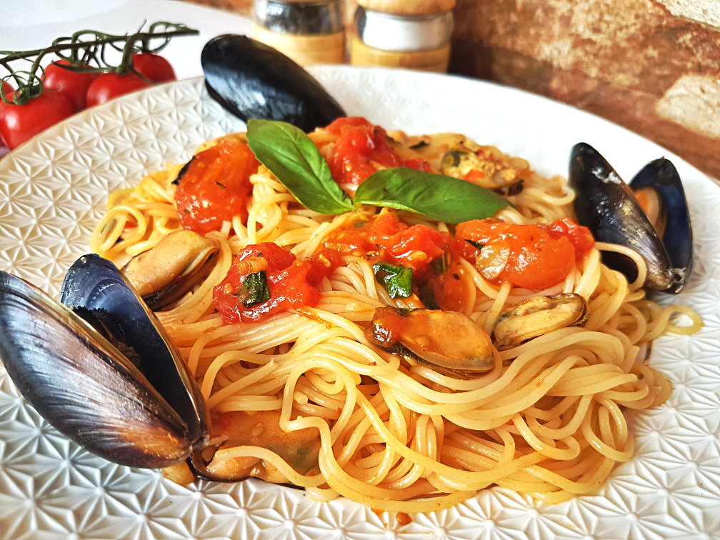 Мидии являются очень полезным продуктом, количество белка превосходит куриное яйцо в два раза, аминокислот больше чем в говядине и свинине. Также мидии содержат большое количество таких веществ как: кальций, калий, железо, натрий, магний, йод и большое количество витаминов A, PP, D и С, и Витамины группы B. Внушительный набор полезных веществ. Нам потребуется: Мидии «киви» 10 штук. Спагетти 100 гр. Томат 100 гр.Петрушка 15 гр. Чеснок 5 гр. Лук репчатый 40 гр. Масло оливковое 15 мл. Соль 10гр. Перец черный. Вино белое 30 мл. *Для начала мидии стоит очистить железной щеткой и удалить нить, которая находится внутри, данная нить называется Биссусная железа. Чтобы сварить спагетти, необходимо взять 1 литр воды, 10 грамм соли и 100 грамм спагетти. Варим до состояния Al dente ( до половины готовности). Пасту лучше выбирать таких производителей как de cecco или barilla (не является рекламой) Репчатый лук нарезаем мелким кубиком и обжариваем на оливковом масле, добавляем мидии, чеснок, перец и