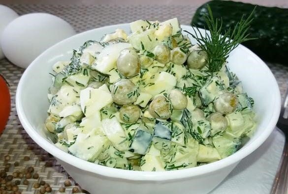 Такой рецепт поможет вам в ситуациях, когда необходимо что-то быстро подать к столу, а вы не знаете, что сделать. Предлагаю приготовить салат по данному рецепту, готовится он быстро и просто, к тому же получается очень вкусным и ароматным. Продукты - один свежий огурец; - четыре вареных яйца; - одна банка консервированного гороха; - пол пучка укропа; - пожеланию и по вкусу можете взять зеленый лук; - 1-2 столовые ложки сметаны или же майонеза, чтобы заправить салат; - соль и молотый перец берите по вкусу. Приготовление 1. Промойте огурец, нарежьте его на кубики. 2. Переложите нарезанный огурец в миску, в которой вы будете заправлять салат. 3. Отварите яйца вкрутую и также нарежьте на кубики. 4. Промойте укроп и зеленый лук (если взяли его). 5. Мелко нарежьте укроп с луком. 6. Откройте банку консервированного гороха, слейте жидкость. 7. Соедините все нарезанные ингредиенты (и горох тоже), посолите и поперчите. Перемешайте. 8. Все готово, перед подачей заправьте майонез (сметаной или же
