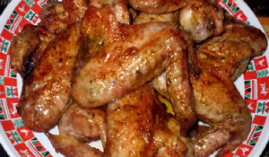 Лук всегда придаёт особенный аромат и вкус тем продуктам, с которыми вместе готовится. Поэтому его часто используют при запекании мяса, целью получения которого является – сочность. Подготовленные крылышки (1 кг) обвалять в соли и молотом чёрном перце, дать напитаться в течение получаса. Дальше обжарить до золотистого слоя с каждой стороны на сковороде и выложить в тарелочку. Три крупные луковицы надо нарезать полукольцами и отправить на ту же раскалённую посуду. После подрумянивания растительного ингредиента, огонь убавляют до медленного, и на луковую поверхность выкладывают готовые крылья. Затем ингредиенты тушатся ещё около двух минуток. Вкуснейшее и простое блюдо быстро готовится, не вызывая усилий.
