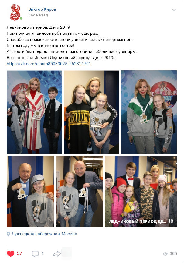 Ледниковый период. Дети 2019 Нам посчастливилось побывать там ещё раз. #ледниковыйпериоддети Спасибо за возможность вновь увидеть великих спортсменов. В этом году мы в качестве гостей! А в гости без подарка не ходят, изготовили небольшие сувениры. Все фото в альбоме: «Ледниковый период. Дети 2019» https://vk.com/album85089025_262316701