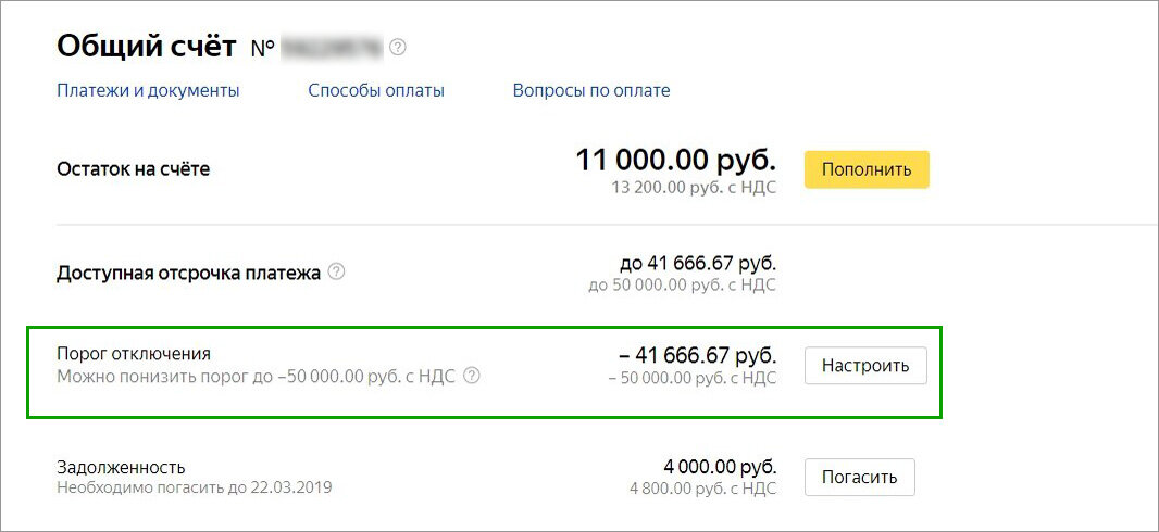 Платить за рекламу удобно по расписанию, но клиенты приходят когда захотят. Чтобы средства на счету не заканчивались в самый неподходящий момент, пригодится порог отключения в Директе. Это личный лимит отрицательного баланса, которым можно управлять самостоятельно. Он доступен пользователям Директа с подключенной отсрочкой платежа из России, Беларуси и Казахстана. Порог отключения находится на странице Общего счёта в Директе, там же его можно и настроить: Как работает порог отключения и как рассчитывается сумма порога При подключении порога отключения счёт на оплату будет выставлен только в конце месяца, если баланс будет меньше нуля. То есть при своевременном его пополнении не придётся тратить время на оплату отдельных выставленных счетов. А задолженность по счёту можно увидеть в новой строке на странице Общего счёта и с этой же страницы её погасить. Величина порога отключения равняется сумме отсрочки платежа с учётом выставленных, но неоплаченных счетов с отложенной оплатой. Например