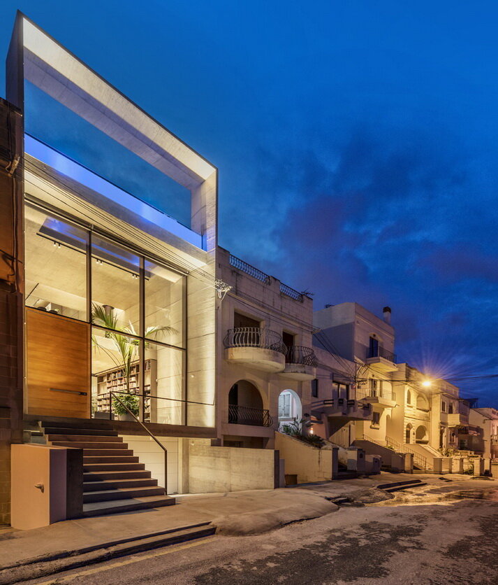 Итальянская архитектурная студия Architrend Architecture провела кардинальную реконструкцию и практически полностью преобразила старый террасный дом в городке Сент-Джулианс на Мальте. Естественно, что соседние дома не пострадали и новый ультрасовременный дом с название «Casa B» точно расположился на старом участке рядом с традиционными строениями. Предметом особой гордости архитекторов является зона отдыха на крыше дома, в которой реализован бассейн с прозрачным дном и стенами. Все это комфортное пространство очерчивает прямоугольная железобетонная балка, возвышаясь над соседними домами. С деревянной террасы возле бассейна открывается роскошным панорамный вид на мальтийское побережье. Открытый и прозрачный фасад сразу же привлекает внимание к геометрически точному железобетонному дому «Casa B». Непривычные, для это района города, полностью стеклянные фасадные стены реализованы на двух жилых этажах. На первом полуподвальном этаже размещен стандартный гараж на две машины. Заказчик дово