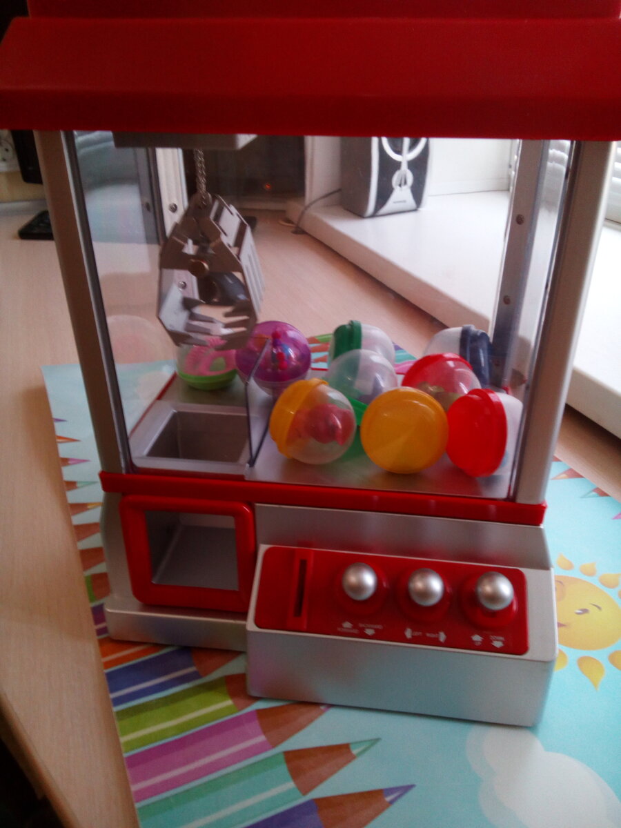 Данный аппарат изначально предполагалось заказать на день рождения дочке, но так получилось, что день рождения алиэкспресс намного раньше и пришлось заказывать, пока скидки не закончились. А точнее были купоны на скидку около 400 рублей, плюс кэшбэк, в итоге стоимость выходила меньше 2000 рублей, но в итоге он достался бесплатно (об этом в конце статьи)! Автомат покупал у этого продавца, стоимость сейчас 2500 рублей, но поверьте оно того стоит, дети просто в восторге и еще сколько денег можно сэкономить, забросив вытащенные игрушки обратно, ведь интересен больше сам процесс. Хотя иногда можно прикупить и добавить новую игрушку для поддержания интереса. Игрушки использовал из автоматов в магазинах, но лучше было бы из киндер - сюрприза, они поменьше и интереснее, так как не видно, что внутри. Закинуть внутрь можно через специальное отверстие вверху. Внимание! Маленькая ручонка хитрого ребенка может и достать игрушки данным способом! В нижней части аппарата кнопка включения/выключения,