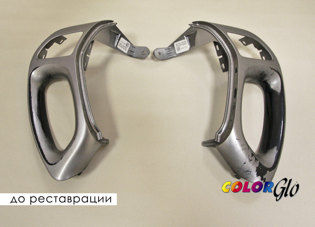 ПОКРАСКА ПЛАСТИКА РУЛЯ АВТОМОБИЛЯ HYUNDAI – РЕСТАВРАЦИЯ ПО ТЕХНОЛОГИИ COLOR GLO INTERNATIONAL Реставрация пластика требует более тщательного и кропотливого подхода. В этом случае мастер-реставратор отремонтировал две пластиковые детали. Реставрация заняла ДВА ЧАСА. Реставрация пластика требует более тщательного и кропотливого подхода. В этом случае мастер-реставратор отремонтировал две пластиковые детали. Реставрация заняла ДВА ЧАСА. Для реставрации пластика используются: · Реставрационные материалы Color Glo International для пластика. · Специальная краска «Серебро» для пластика. Технология реставрации пластика имеет особенности: 1. Требует основательной подготовки поверхности. 2. Нужна многократная грунтовка реставрационным составом с тщательной подготовкой к нанесению следующего слоя. 3. Покраска особо тонким слоем в несколько слоев. 4. Просушка краски - особо щадящая. Каков эффект реставрации? Технологии Color Glo восстанавливают поверхность и возвращают блестящий – во всех с