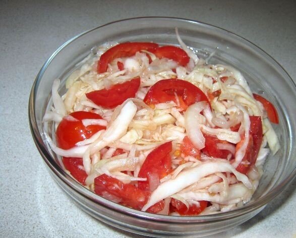 Очень полезный и питательный салат, готовится все быстро и просто. Отлично подойдет к серии, когда необходимо что-то быстро приготовить. Много времени такое блюдо у вас не займет. Такой салат хорошо дополнит любое мясо. Советую приготовить его по данному рецепту, не пожалеете! Продукты - 300 грамм белокочанной капусты; - одна луковица; - соль берите по вкусу; - четыре или шесть помидоров; - три столовых ложек рафинированного растительного масла; -по вкусу берите яблочный уксус. Приготовление блюда 1. Для начала промойте и нашинкуйте капусту, далее полейте ее яблочным уксусом и перемешайте, посолите. 2. Оставьте капусту для того чтобы она пустила сок на десять минут. 3. За это время очистите и промойте лук, нарежьте его на полукольца. 4. Промойте помидоры, нарежьте их на дольки. 5. Затем соедините все ингредиенты, заправьте все рафинированным растительным маслом и тщательно перемешайте. 6. Все готово, как и говорил, быстро и просто, можно сразу подавать к столу! Всем приятного аппетита!