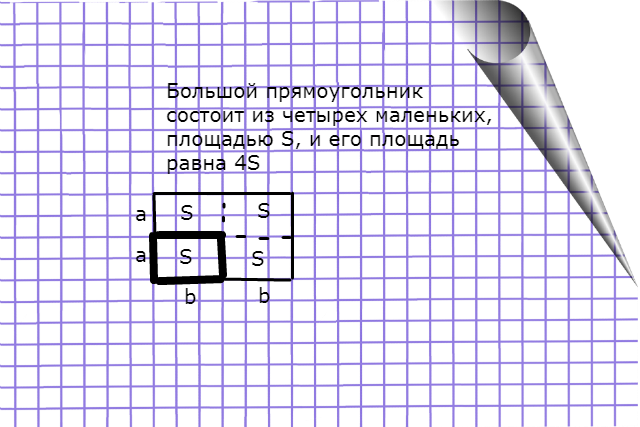Сегодня мы поговорим о науке геометрии. Ее все любят, но боятся, потому что в ней непонятно, как додумываться до правильных решений. Задача. Имеется прямоугольник со сторонами 2 и 3. Чему равняется площадь такого прямоугольника? Ученик: 3 * 2 = 6. Правильно. Мы можем посчитать по формуле, а можем просто нарисовать прямоугольник, разрезать его на клеточки, и посчитать количество единичных клеточек. Их будет шесть. Теперь следующий вопрос, опять же по геометрии. Если мы возьмем и каждую сторону прямоугольника увеличим в два раза, то во сколько раз увеличится площадь? Ученик: в 4 раза. Вопрос: почему? Почему не в два раза? Ученик: потому, что исходный прямоугольник занимает ровно четвертую часть конечного. Нарисуем картинку. Рисуем прямоугольник. Затем продолжим две его смежные стороны за пределы прямоугольника, увеличим их в два раза, и нарисуем новый большой прямоугольник. В нем помещается ровно четыре исходных прямоугольника. Другое решение — взять формулу площади прямоугольника, S
