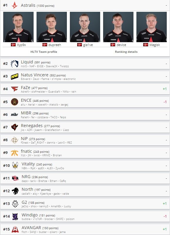 Обновлённый рейтинг топ-30 команд от HLTV на 22.04.201 Хочется добавить, что в данном рейтинге значительно усилили свои позиции команды из СНГ. А именно: Avangar(Казахстан) с 16 на 15 место и Forze(Россия) с 30 на 20 место в мировом рейтинге.