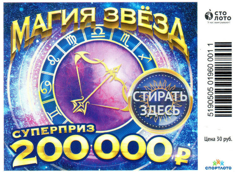 Сегодня мы с вами поиграем и посмотрим на мгновенную лотерею «Магия звёзд». У нас будет 20 билетов, которые мы все откроем и посчитаем выигрыш. Если конечно он будет :) Итак, данная лотерея проводится на основании распоряжения Правительства Российской Федерации от 14.09.2009 № 1318-р. Организатором является Министерство Финансов РФ. Оператором ООО «Спортлото». Ну а распространителем всем известное АО «ТД «Столото». По правилам все предельно просто: лотерея является мгновенной с одним игровым полем, с которого необходимо удалить защитный слой. Под защитным слоем мы можем обнаружить либо число, это будет означать, что мы выиграли соответствующую денежную сумму. Либо знак зодиака. Если мы соберем три билета с разными знаками, приходящимися к одному времени года, тоже получим денежный приз. Суперприз - 200 000 руб. В одной серии печатается 1 000 000 билетов. Стоимость одного билета 30 рублей. Итого выручка от одной серии 30 миллионов рублей. Призовой фонд лотереи - 60% от выручки, получает