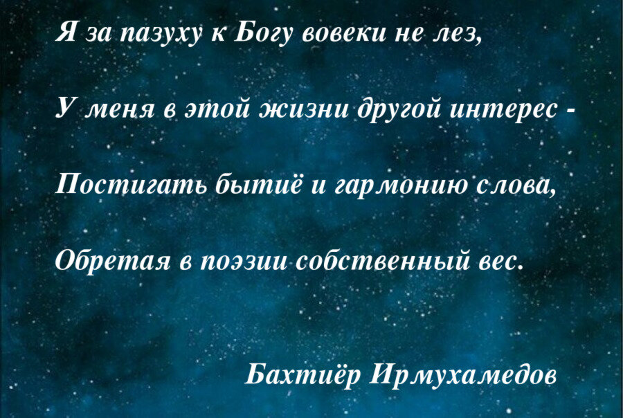 Я за пазуху к Богу вовеки не лез, У меня в этой жизни другой интерес – Постигать бытиё и гармонию слова, Обретая в поэзии собственный вес. Бахтиёр Ирмухамедов