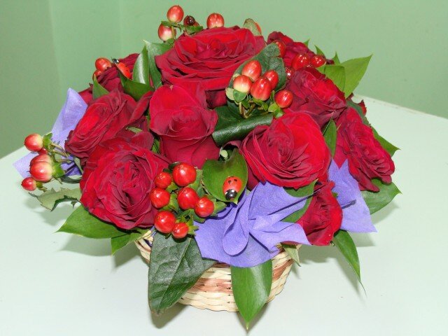 розочки, можно случайно сломанную ( а такое часто бывает в цветочной торговле), ну или обрезать длинную. Растение которое называется рускус (ну или любое другое) И гиперикум (или как называют некоторые хиперикум) Уверяю вас, что подобные композиции можно делать из чего угодно, даже одуванчики с подорожником будут смотреться замечательно... Всю эту зелень можно спокойно купить в любом цветочном магазине ил нарвать подобное на даче.