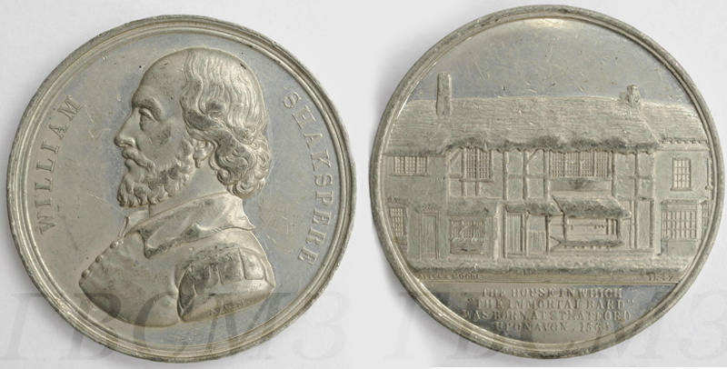 На оборотной стороне – рельефное изображение фасада здания с поясняющей надписью: «THE HOUSE IN WHICH/ THE IMMORTAL BARD/ WAS BORN. AT STRANFORD/ UPON AVON. 1564» (Дом, в котором родился бессмертный поэт в Стретфорд-на-Эйвоне. 1564).